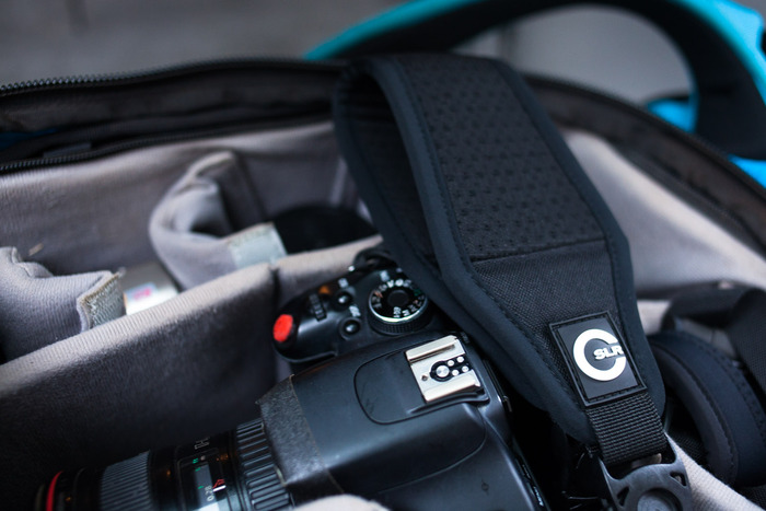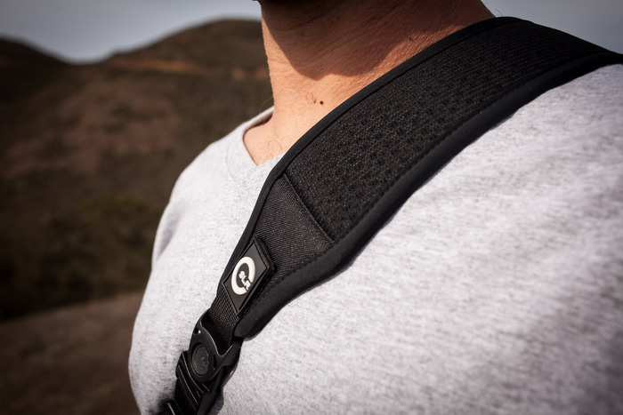Część paska, która spoczywa na barku ma specjalne otwory wentylujące aby odprowadzać ciepło oraz wilgoć aby utrzymać naturalną temperaturę i nie narażać skóry na odparzenia czy podrażnienia. Z przodu poniżej wcześniej opisywanego segmentu Air Strap znajduje się suwak, po dopasowaniu długości paska umożliwia on jego szybkie wydłużenie pozwalając tym samym na wygodny chwyt aparatu. Wyjściowa pozycja za plecami sprawia że podczas marszu znajduje się on w bezpieczniejszej pozycji chroniącej go przed uszkodzeniami.