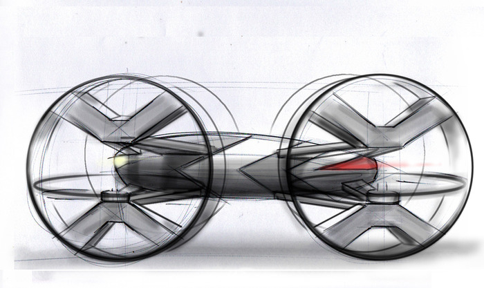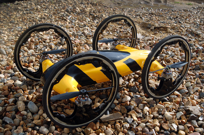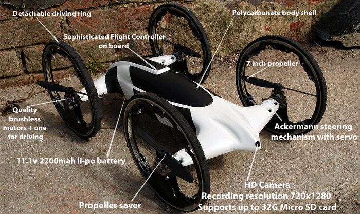 Model wyposażony został w koła o średnicy 22 cm, które wedle zapewnień autora pozwalają mu doskonale sobie radzić na trudnych terenach, a na płaskich powierzchniach osiągać dużą prędkość. Możliwe są szybkie przejścia między trybem jazdy a trybem lotu, przy pomocy przełącznika, który łączy wszystkie moduły urządzenia (pozwala on również włączyć kamerę ). Sam start i lądowanie pojazdu odbywają się natomiast ruchem pionowym.