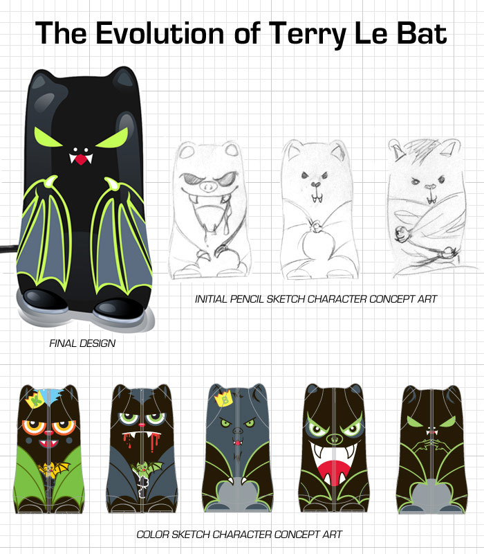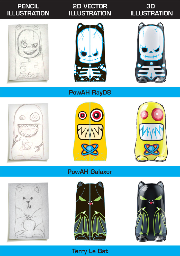 Na chwile obecną zainteresowani mają do dyspozycji dziesięć różny wzorów postaci: Larry LobstAh, Shocky Shark, Psy, RayD8, Powah KowAh, Galaxor, Turbo Turtle, Powly Owly, Pawly PandAh i Terry Le Bat (dostępna tylko przy zamówieniach przez kickstarter’a). Wyposażone są one w baterię litowo-jonową o pojemności 5200 mAh oraz dwa porty USB i microUSB, umożliwiające ładowanie mobilnych urządzeń oraz ponowne ładowanie BatteryBot’a.