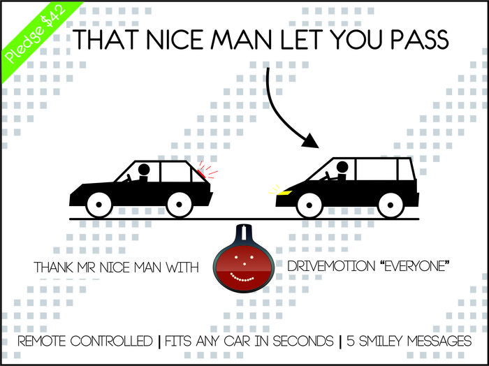 Drivemotion™ to gadżet samochodowy pozwalający na komunikowanie się pomiędzy kierowcami za pomocą wyświetlacza LED przyczepianego na tylnej szybie auta. Wystarczy nacisnąć guzik na pilocie aby wyświetlić odpowiednią informację.