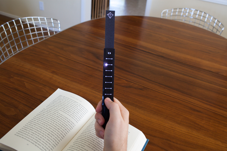 Urządzenie posiada dwa rzędy diod. Czytelnik poprzez dotknięcie diody umieszczonej na wysokości miejsca w którym kończy czytać będzie wiedział gdzie zakończył lekturę. Dodatkowo możliwość włączenia lewej lub prawej diody powoduje, że użytkownik od razu wie czy skończył czytać po lewej czy po prawej stronie. Obudowa eBookmark zrobiona została z ładnie wyglądającego, lekkiego gatunku drzewa – balsa.