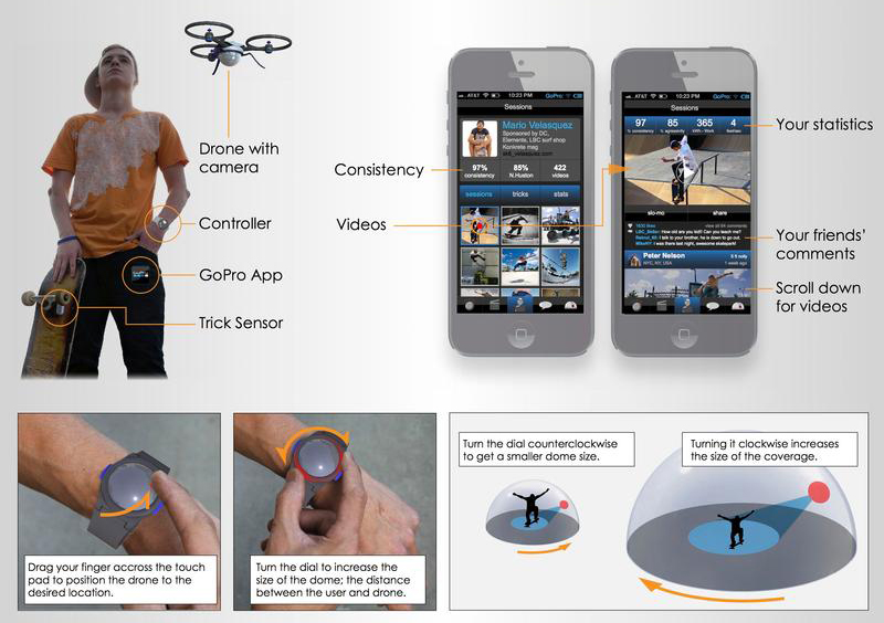 Ustawienie, z której strony kamerować ma dron odbywać miałyby się przy pomocy opaski wyposażonej w wypukły interfejs, symulujący przestrzeń – kopułę, po jakiej może poruszać się latający robot-kamerzysta. Natomiast definiowanie odległości, miałoby przebiegać podobnie jak powiększanie i oddalanie obrazów na telefonach dotykowych – czyli przez rozsunięcie bądź zsunięcie dwóch palców.