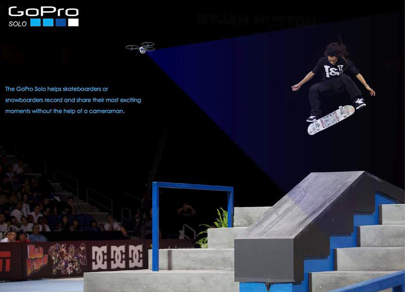 Tak powstał projekt GoPro Solo – dron, na którego pokładzie umieszczona miałaby zostać kamera reagująca na nadajnik przy nagrywanym obiekcie. Wraz ze wspomnianym nadajnikiem w formie opaski, sensorem do trików oraz aplikacją, całość miałaby pozwolić na wygodne nagrywanie ekstremalnych dokonań.