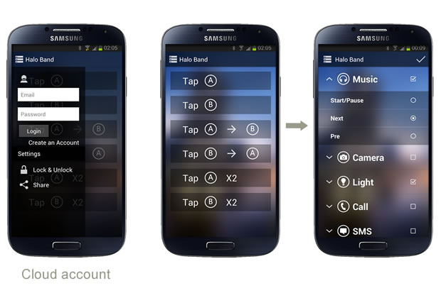 Do obsługi Haloband wykorzystuje się specjalną aplikację instalowaną w telefonie. Dzięki niej można zaprogramować funkcje telefonu, które zostaną uruchomione po przyłożeniu go do opaski. Przykładowo można zaprogramować szybkie wykonanie zdjęcia, uruchomienie latarki w telefonie, zmianę odtwarzanego utworu, odblokowanie/zablokowanie telefonu, wybranie numeru telefonu czy uruchomienie nawigacji prowadzącej do domu.