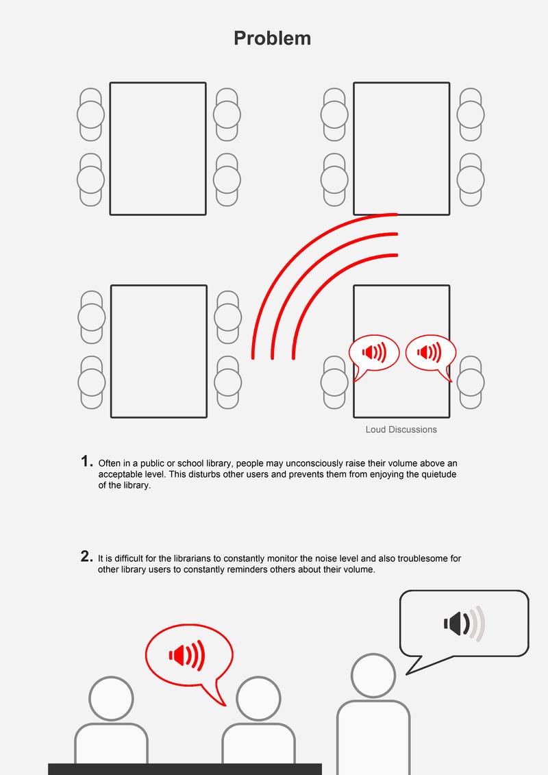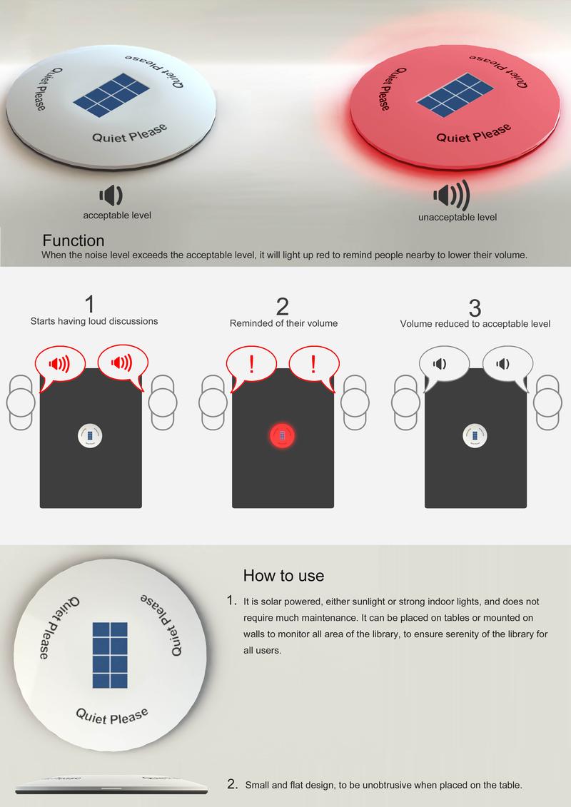 Koncept Library Silence Reminder rozwiązuje problem uciszania głośno zachowujących się osób. Urządzenie stale monitoruje poziom otaczających je dźwięków. W sytuacji, gdy poziom hałasu podniesie się ponad dopuszczalny zakres Library Silence Reminder podświetla się na kolor czerwony i w ten sposób przypomina osobom znajdującym się w bliskiej odległości o obniżeniu głosu.