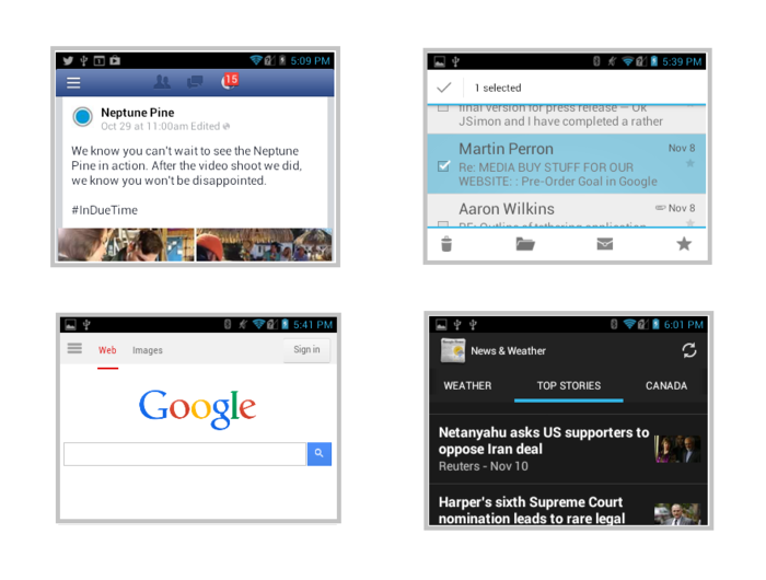 Sercem Pine jest dwurdzeniowy procesor Qualcomm Snapdragon S4 1,2 Ghz wspierany przez 512 MB pamięci RAM. Wszelkie informacje wyświetlane są na dotykowym ekranie TFT o przekątnej 2,4 cala i rozdzielczości 320×240 pikseli. Urządzenie wyposażone jest również w 2 aparaty – jeden z przodu o rozdzielczości VGA, a drugi z tyłu z matrycą o rozdzielczości 5 Mpix. Co warte podkreślenia oba aparaty wyposażone są w doświetlające diody LED.