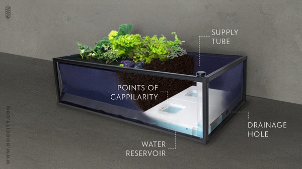 Całość została oparta na specjalnych donicach z materiałową obudową, rozciągniętą na wytrzymałym szkielecie. Jednym z najistotniejszych elementów jest jednak specjalna kratka umieszczona na spodzie donicy, pod warstwą ziemi. Dołączona do zestawu rurka, doprowadza do niej wodę. Utworzony w ten sposób odstęp między wodą, a ziemią sprawia, że wilgoć jest cały czas obecna w ziemi, jednakże korzenie roślin nie stoją bez przerwy w wodzie. Rozwiązanie to ma również inne auty. Naturalna przerwa sprawia, że woda trafiająca do roślin jest odpowiednio napowietrzona. Ponadto twórcy upraw, twierdzą że system pozwala ograniczyć częstotliwość podlewania, do nawet jednego razu na trzy tygodnie. Jest to możliwe dzięki zminimalizowaniu strat wody. Zgodnie z deklaracją, oszczędność ma sięgać nawet 80 procent, względem konwencjonalnych rozwiązań.