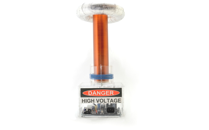 - Zasielanie cewki Tesli, znajduje się wewnątrz głównej obudowy, a całość wystarczy podłączyć go do gniazdka za pomocą kabla sieciowego, zasilając w tym przypadku prądem DC.