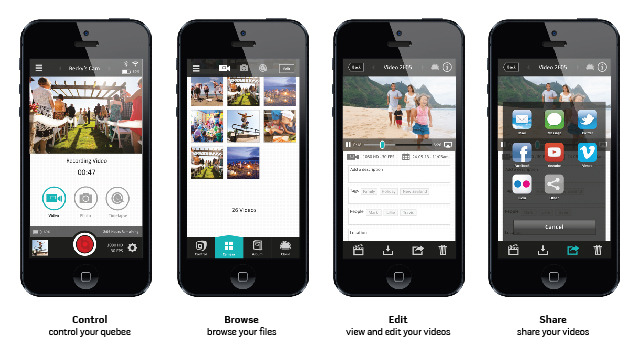 Poza wspomnianym przyciskiem na obudowie Quebee można obsługiwać za pomocą aplikacji dedykowanej smartfonom z Androidem i iOS-em. Poza możliwością uruchomienia nagrywania pozwala ona na skonfigurowanie wielu kamerek tak, aby pracowały jednocześnie. Aplikacja zapewnia również synchronizację z danymi przechowywanymi „w chmurze”, do której Quebee automatycznie wysyła nagrane filmy.