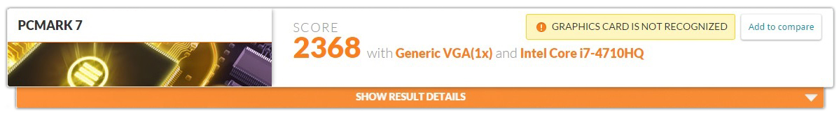 Testy wykonane z wykorzystaniem PCMark 7 nieco nas zaskoczyły. Program źle zidentyfikował podzespoły, mimo niedawno wydanej aktualizacji bazy. Osiągnięty wynik na poziomie 2368 punktów jest raczej mizerny i plasuje pełnowymiarowy laptop, nawet za niewielką hybrydą notebooka i tabletu jaką jest Swich 10. Sporo lepiej wypadły również testowane przez nas niedawno, miniaturowe komputery ZBOX.