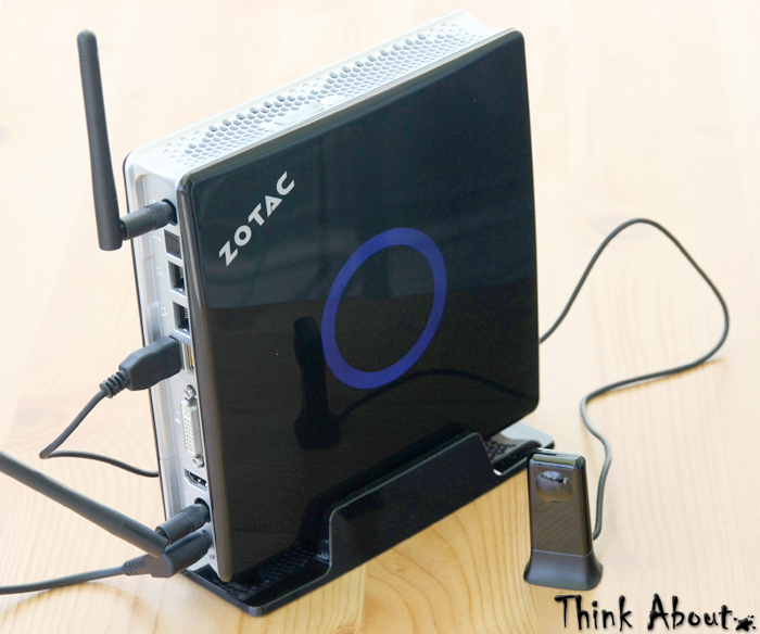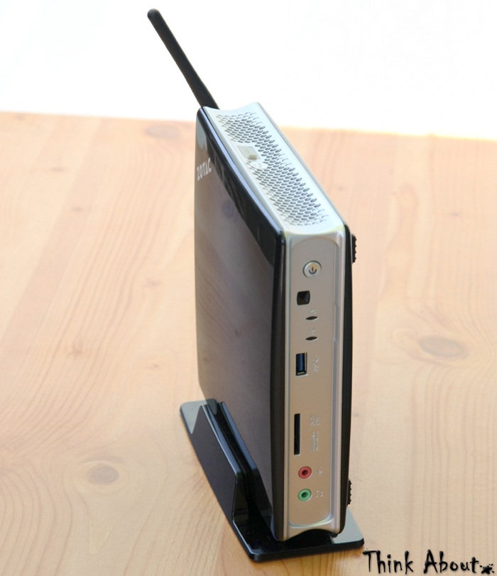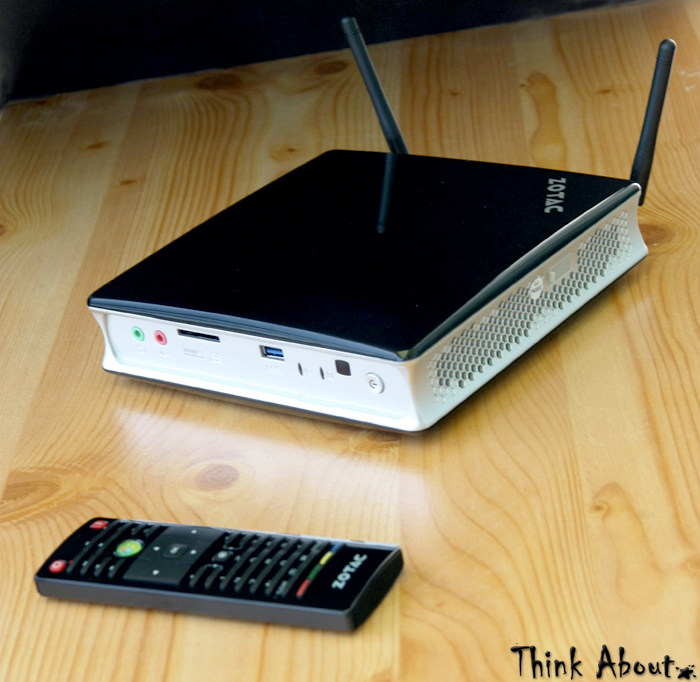 Recenzowany ZBOX został umocowany na monitorze i w tym miejscu pozostał niemal do końca testów. Takie rozwiązanie ma jednak pewne wady – szczególnie w przypadku dużych ekranów obsługa komputera może być nieco utrudniona. O ile do umiejscowienia przycisku zasilania dość łatwo się przyzwyczaić, szczególnie że ulokowany został na rogu obudowy, a dzięki swojej budowie trudno nie wyczuć go palcami to każdorazowe „wymacywanie” portów USB czy audio może być frustrujące. Trudno winić za to producenta, zastosowanie mocowania VESA to tylko jedna z oferowanych pozycji, umożliwiono również zdalne sterowanie. Zasilany dwoma bateriami pilot wykonany został z eleganckiego połyskliwego plastiku. Niestety praca z jego pomocą pozostawia wiele do życzenia, konkurencja w tej kwestii oferuje bardziej intuicyjne i skuteczne rozwiązania. Właściwie jedynym wygodnym zastosowaniem zdaje się być odtwarzanie filmów. Narzekać można na opóźnienia, słaby zasięg mimo zastosowania dodatkowego odbiornika, czy mało trafne przypisanie funkcji do klawiszy.