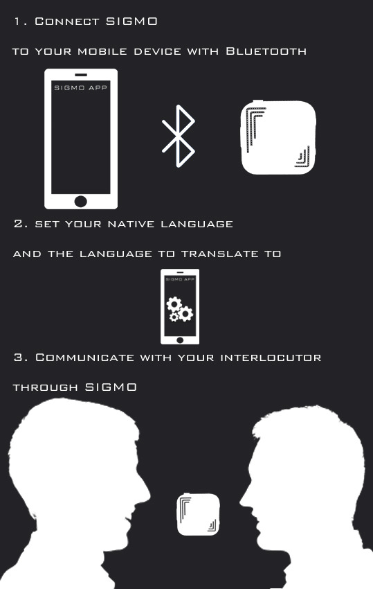 To zgrabne,bez problemu mieszczące się w dłoni (4cm x 4cm) urządzenie w czasie rzeczywistym potrafi tłumaczyć tekst mówiony. Po naciśnięciu guzika i powiedzeniu zdania SIGMO błyskawicznie „wypowie” je w wersji przetłumaczonej, obsługując przy tym 25 języków. Gadżet pracuje w dwóch trybach (z języka ojczystego na obcy i z obcego na ojczysty) wybór trybu jest banalnie prosty, wystarczy przytrzymać jeden guzik lub drugi w zależności od tego w którą stronę przebiegać ma translacja.