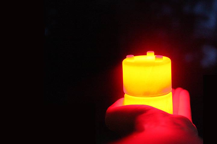 Jak działają klocki Tangeez? Każdy element ma na górze trzy wypustki, natomiast na spodzie trzy odpowiadające wgłębienia, umożliwiające łączenie klocków ze sobą. Całość wykonana jest z białego tworzywa rozświetlanego od wewnątrz dzięki trzy-kolorowym diodom LED. Po połączeniu klocków jednym 'zębem’ całość rozświetli się na jeden z trzech kolorów: czerwony, zielony lub niebieski, w zależności od tego, z które zagłębień zostanie połączone z analogicznym elementem drugiego klocka. Przy połączeniu dwoma 'zębami” zapalą się dwie diody, analogicznie będzie w wypadku połączenia wszystkimi trzema. Kolory diod będą się mieszać pozwalając użytkownikowi dostosowywać kolor. Do zestawu dołączane są również bazowe płytki wyposażone jedynie w wypustki, aby pierwsze klocki, znajdujące się na samym dole świeciły na tej samej zasadzie co pozostałe.
