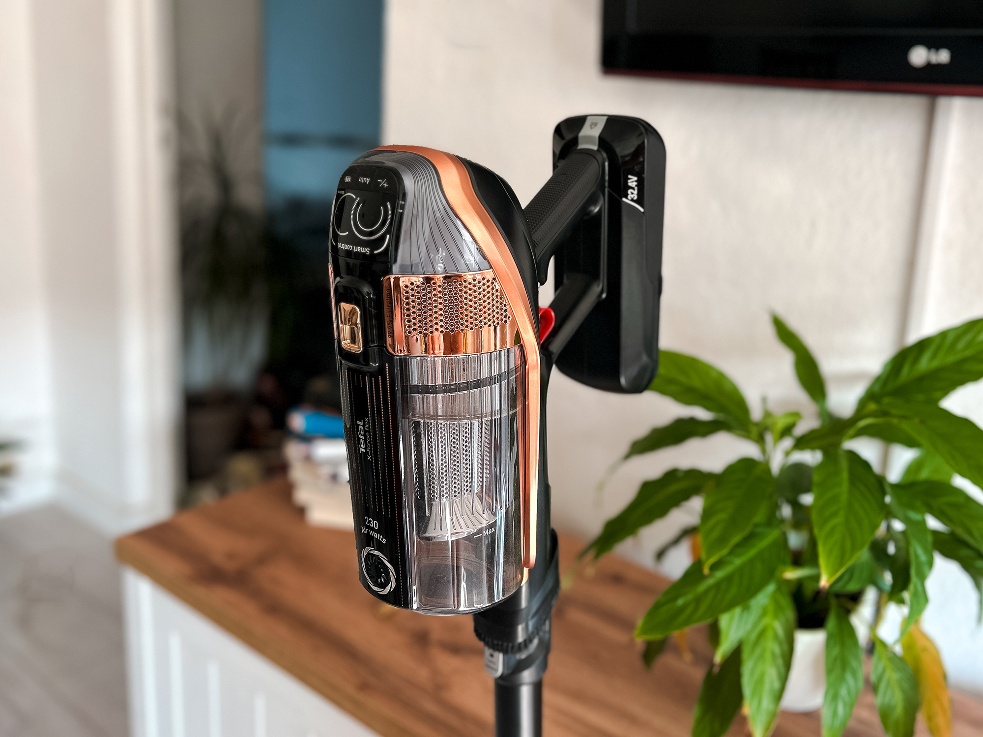 Nowy Tefal potrafi naprawdę dużo. Ma 315 AW mocy ssącej, więc spokojnie radzi sobie z dywanami, sierścią czy większymi okruchami. Bateria 25,2 V o pojemności 4000 mAh wystarcza nawet na 120 minut pracy w trybie ECO, a pełne ładowanie trwa około 3 godzin. Do wyboru są cztery poziomy mocy – od cichego trybu Eco po Boost, który wyciąga z odkurzacza wszystko, co ma.